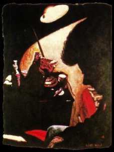 For his last painting, as Morrison wrote in the Times obit, "Andrew Wilf painted something else he saw — himself, as a shadow figure sitting at a drug-strewn table. 'Peace Through Chemistry,' he had entitled it."