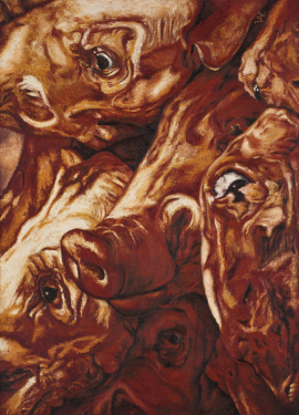 Wilf's expressionism reached its zenith with a series of paintings inspired by the butcher shops of Grand Central Market, across the street from his downtown loft. In paintings such as "Dead Ends," lifeless eyes in bloody piles of pig snouts and calves' heads stare at the viewer with both astonishment and accusation. As Patt Morrison of the L.A. Times wrote in an obituary of Wilf in 1982, these are "choice cuts sliced out and the offal tossed aside, a metaphor for the castoffs of human greed."