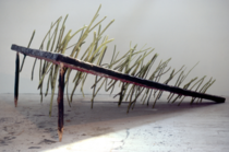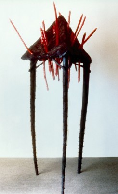 The oppositional dynamic of her "feminine" image and her "masculine" work is mirrored in the sculpture itself.