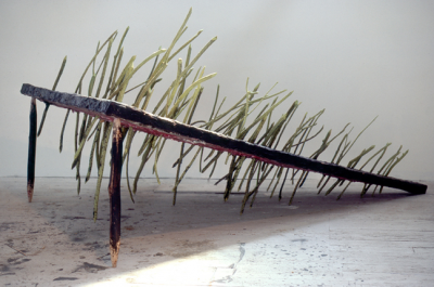 At her studio on Seaton Street (in what is today known as the Arts District), Sterritt constructed a variety of primitive-looking structures: Tripod shapes that supported heavy stones, or giant, skeletal towers that loomed over the viewer at a height of nearly nine feet.